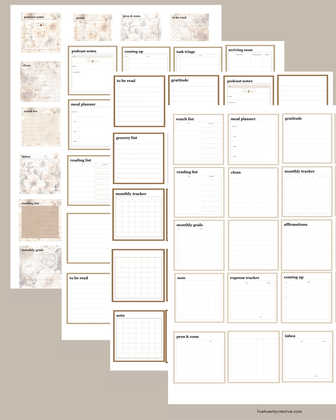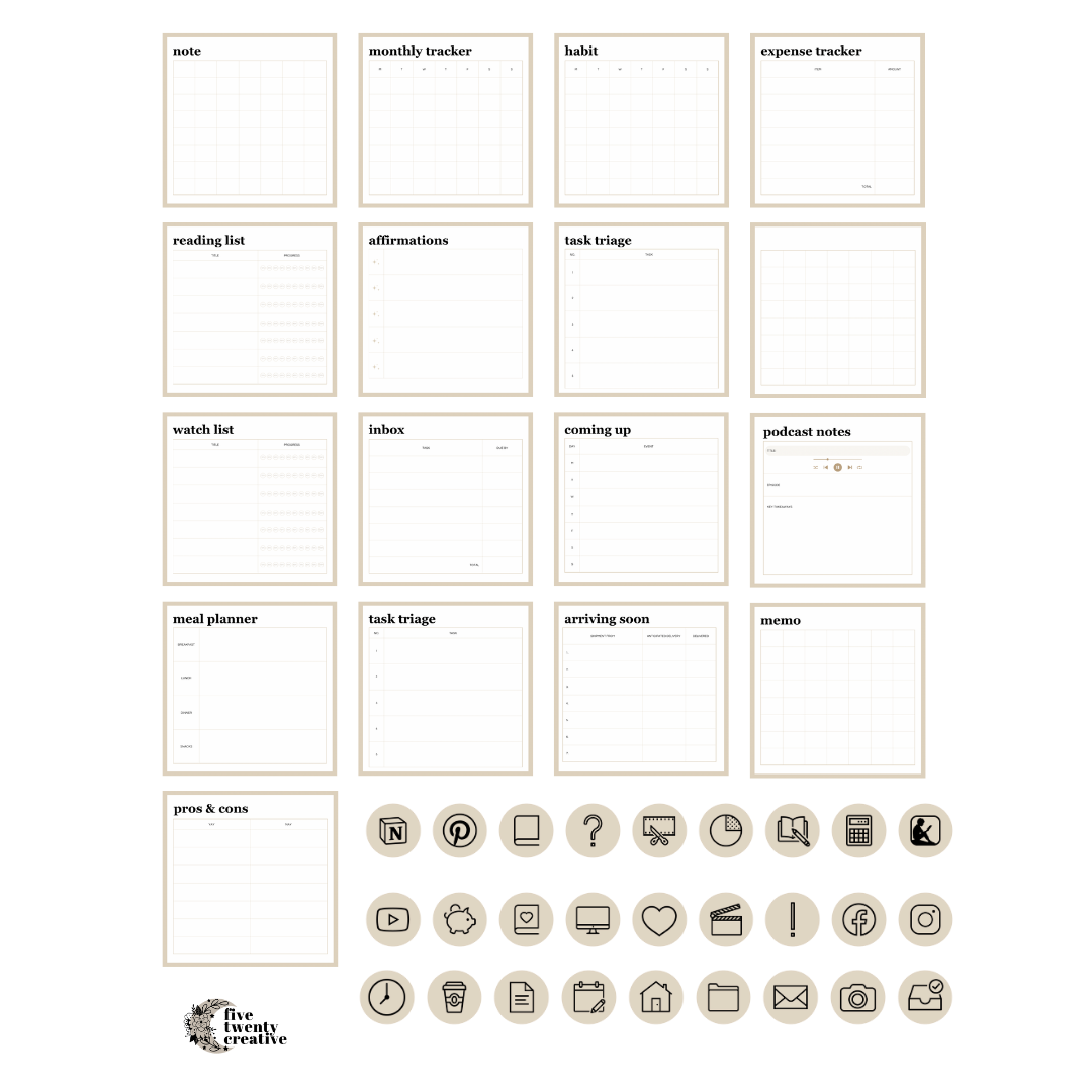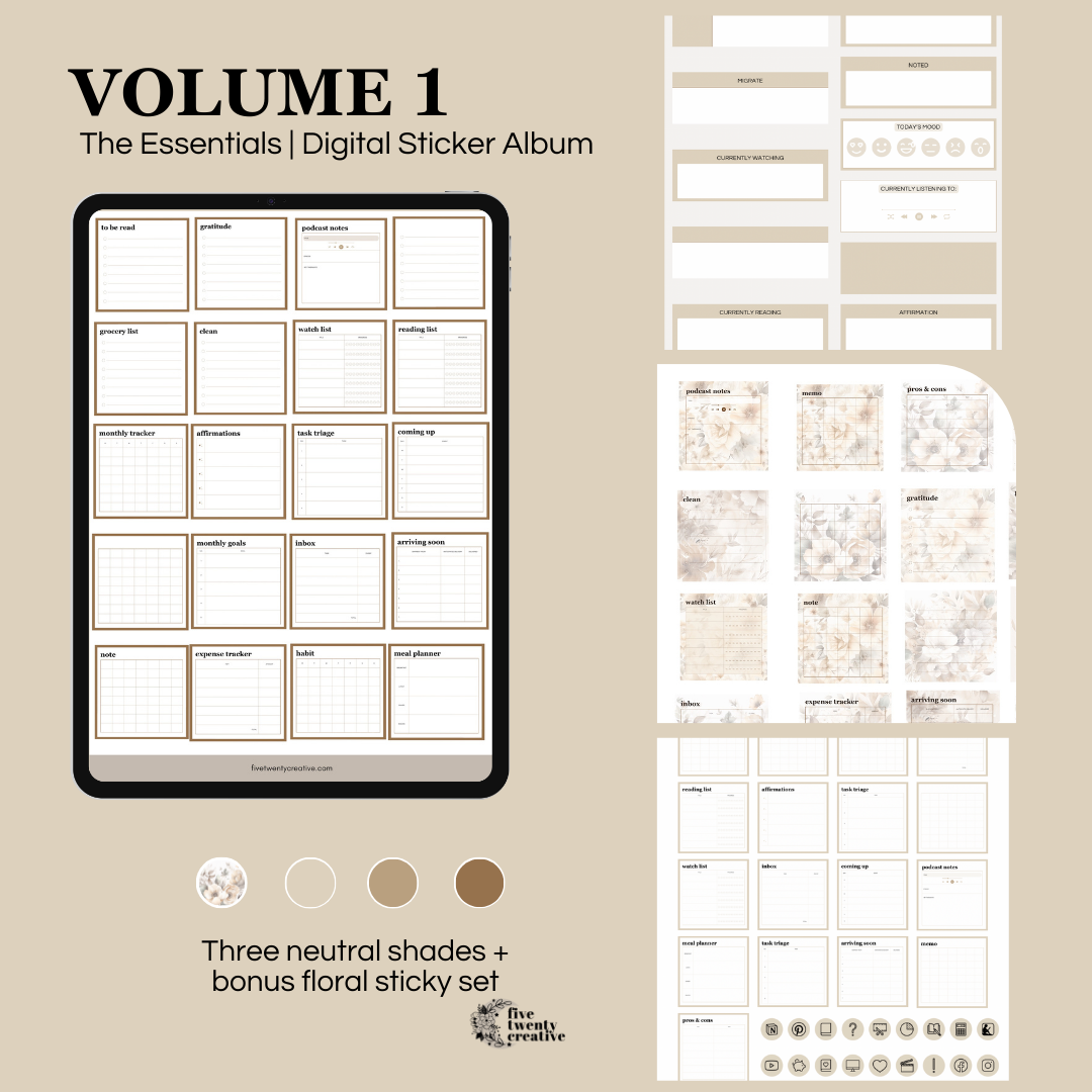All of our essential digital sticky notes, labels and icons in one album. Three neutral colors to choose from, plus a bonus set of floral sticky notes with both transparent and solid backgrounds.