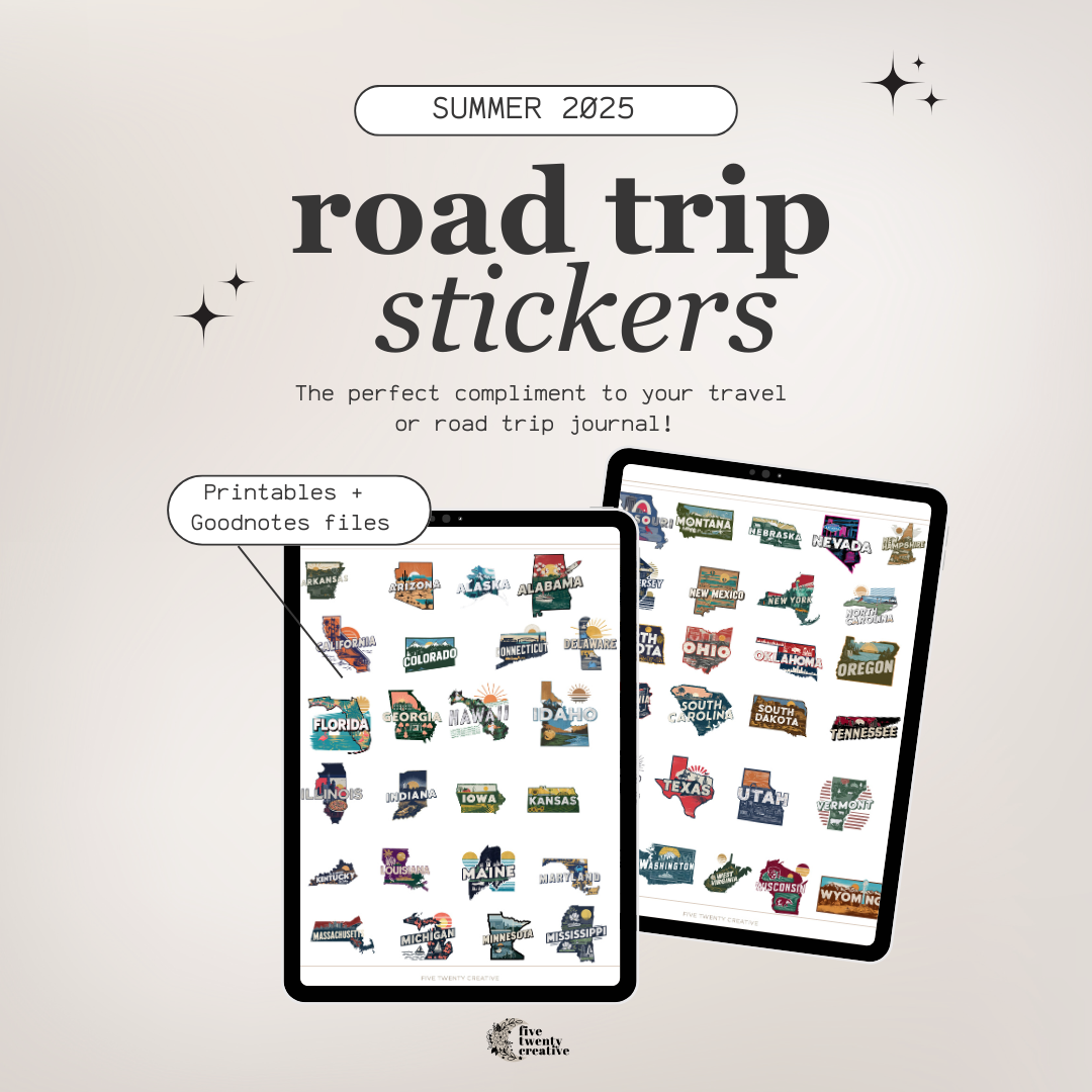 From the East Coast to the West Coast, these fun Digital Stickers have you covered. Perfect for your travel journal, each sticker represents a state and adds a colorful touch of fun. Happy road tripping!